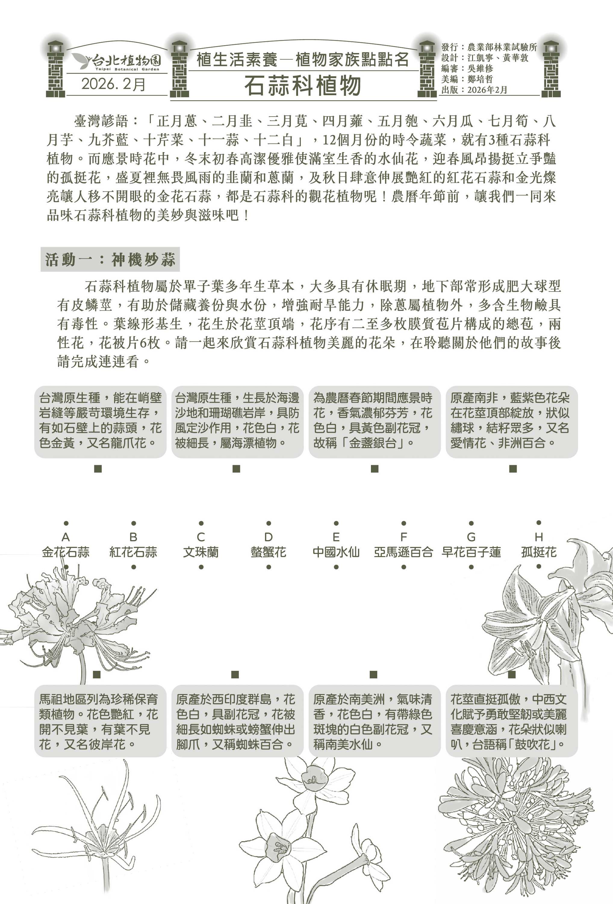 臺灣諺語:「正月蔥、二月韭、三月莧、四月蕹、五月匏、六月瓜、七月筍、八月芋、九芥藍、十芹菜、十一蒜、十二白」,12個月份的時令蔬菜,就有3種石蒜科植物。而應景時... |