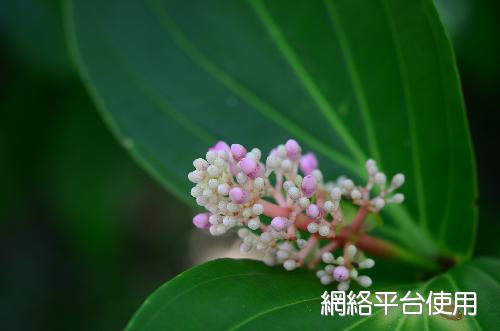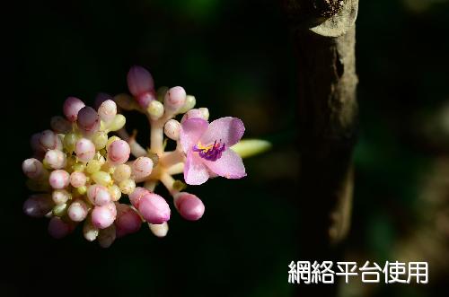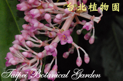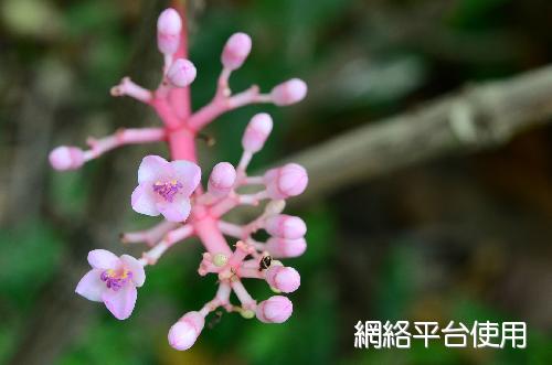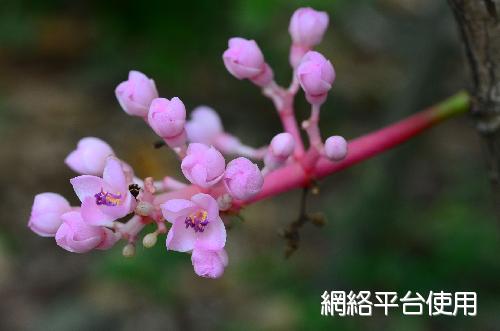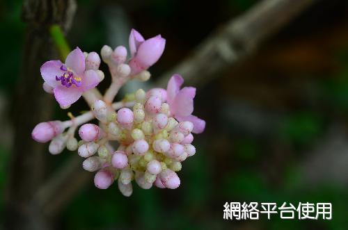 花序及花被的描述:繖形圓錐狀花序自枝端伸出下垂,花序長約30㎝。花瓣5枚,花徑約1㎝,花色桃紅,花藥紫色。