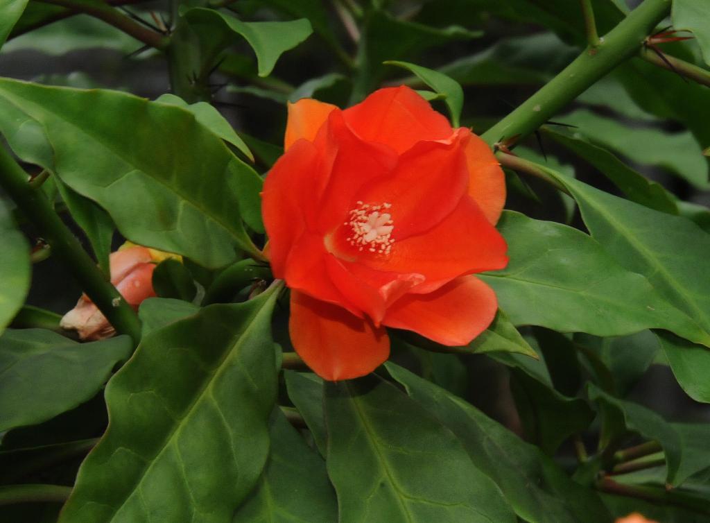 花序及花被的描述:總狀花序頂生,花色橙紅色,似迷你玫瑰,呈輻射狀,直徑 5~6 cm,屬一日花。花單生,每個花序只開一朵花,花瓣跟花萼不容易區分,每朵花都有100 支以上的雄蕊。