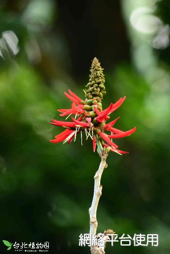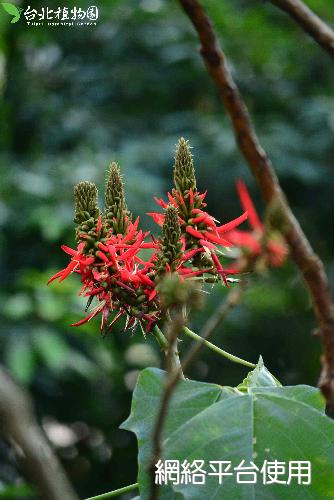 花序及花被的描述:花頂生,總狀花序,朱紅色的蝶形花,花萼分裂為看似辣椒的條狀花朵。盛開於落葉之後,凋落時會轉成紫紅色。