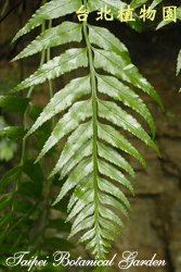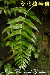 葉的描述:葉紙質,表面綠色,背面紫褐色,基部具鱗片,一回羽狀複葉,葉長30~50cm,革質,基羽片最長,羽片向上漸縮,頂羽片小,側羽片狹長, 7~15cm長,1~2.5cm寬,邊緣鋸齒狀,羽片側脈二叉分支。